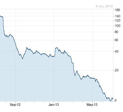 With all options closed, was there a last ditch attempt by the promoters to shore up the confidence in order to provide the lenders (who are these people?) a wide exit to dump the shares on gullible investors? On 13th July, 2012, the promoter bought 75,000 shares @ Rs.144 from the open market. That's when this game of musical chairs ended, with the stock falling by 50% within 3 weeks (there is something about this no.3). However it didn't stop there and collapsed by 96%. Here is the stock price graph, which can even put a waterfall to shame.